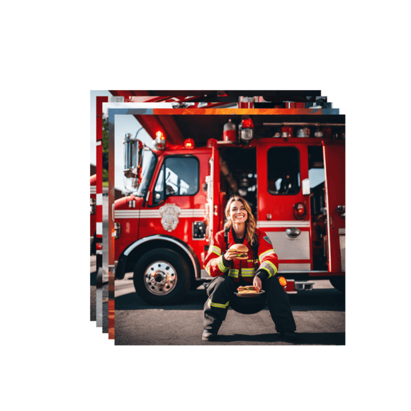 We wondered what its artistic bent would be like, so asked it to create some images of firefighters eating one of our burgers. Below is what it came up with.